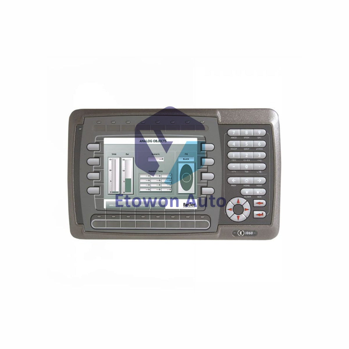The Mitsubishi E1060 is a durable operator terminal for industrial automation. It provides a reliable human-machine interface (HMI) for machine control. This terminal includes an integrated keypad for direct operator input. It is designed for easy panel mounting in control cabinets. The housing uses robust powder-coated aluminum. The E1060 connects via Ethernet and serial ports for versatile communication.